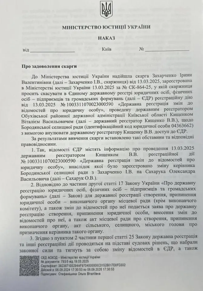 Цим рішенням суду скасовано наказ Мін’юсту №616/5 від 04.03.2025 р. Утім, на його підставі реєстратор не може внести Олександра Сахарука до реєстру як голову, оскільки він фактично відсторонений на підставі іншого, пізнішого, наказу Мін’юсту №793/5 від 19.03.2025 р. На підставі цього ж наказу в реєстрі поновлено відомості про Захарченко Ірину Валентинівну як в.о. селищного голови.