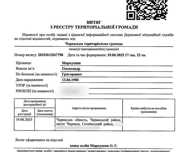 |Екс-мер Ірпеня Олександр Маркушин знявся з реєстрації в Ірпінській міській територіальній громаді і 19 серпня 2025 року зареєструвався у Соснівському районі міста Черкаси. Про це свідчить інформаційна довідка, яка опинилася у розпорядженні журналістів. У міськраді Ірпеня вважають, що це спроба Маркушина вплинути на суд.